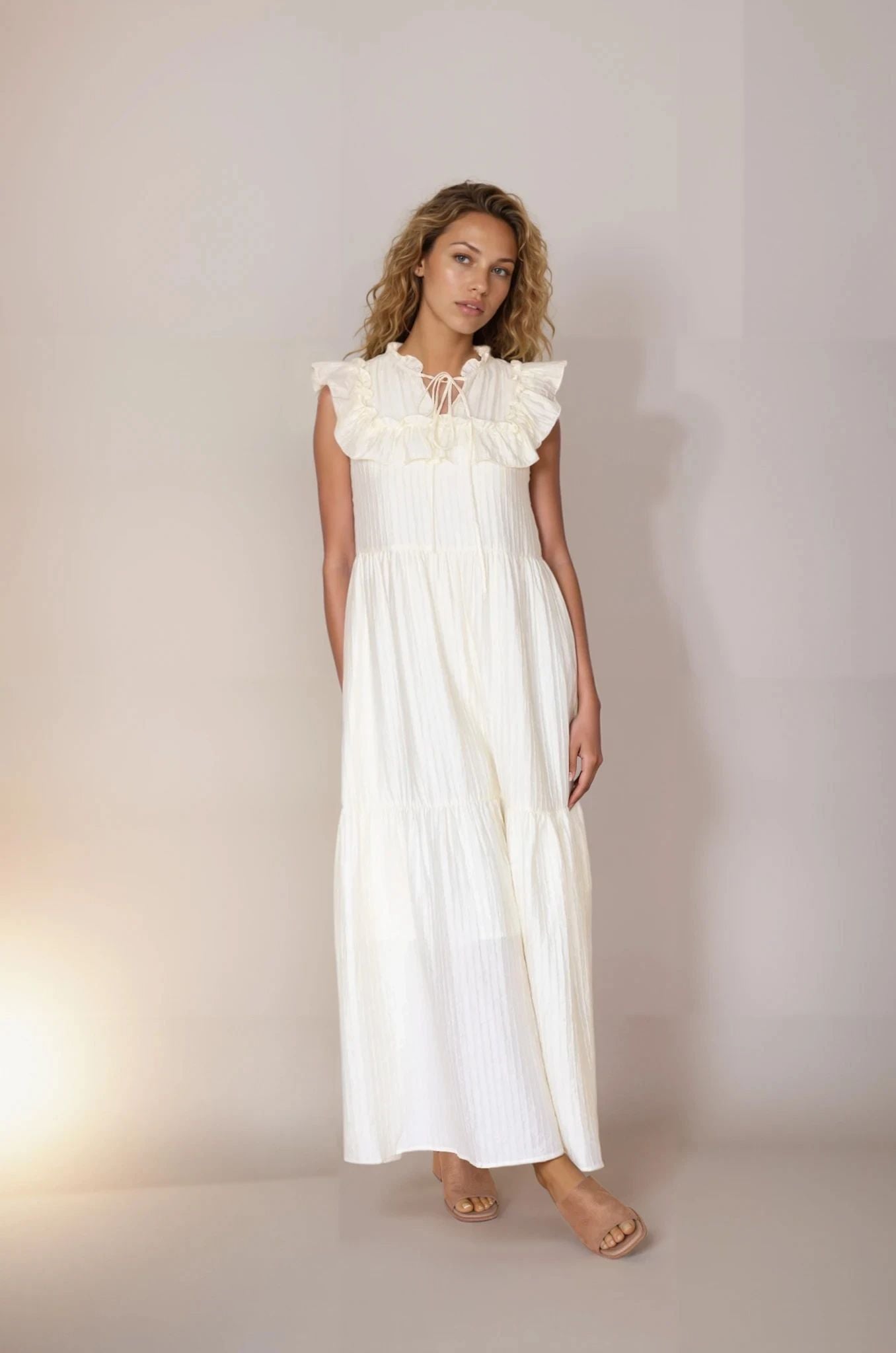 The Mary Maxi Dress in Butter Yellow features a sophisticated flutter front with an elegant tie detail, creating a graceful silhouette. Crafted in a lovely pastel yellow fabric with a subtle shine, this fully lined maxi-length dress offers both comfort and refined style, perfect for your any occasions.