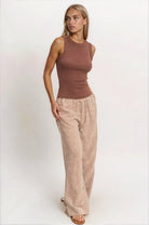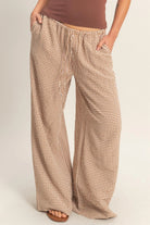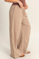 Embrace pattern with these woven gingham trousers, defined by a breezy, wide-leg silhouette. They feature a flexible elasticized waistband secured by a drawstring tie and hidden side pockets. A unique decorative button-fly placket adds visual flair. Style with a tucked-in tee and ankle boots for a chic, relaxed aesthetic.