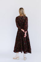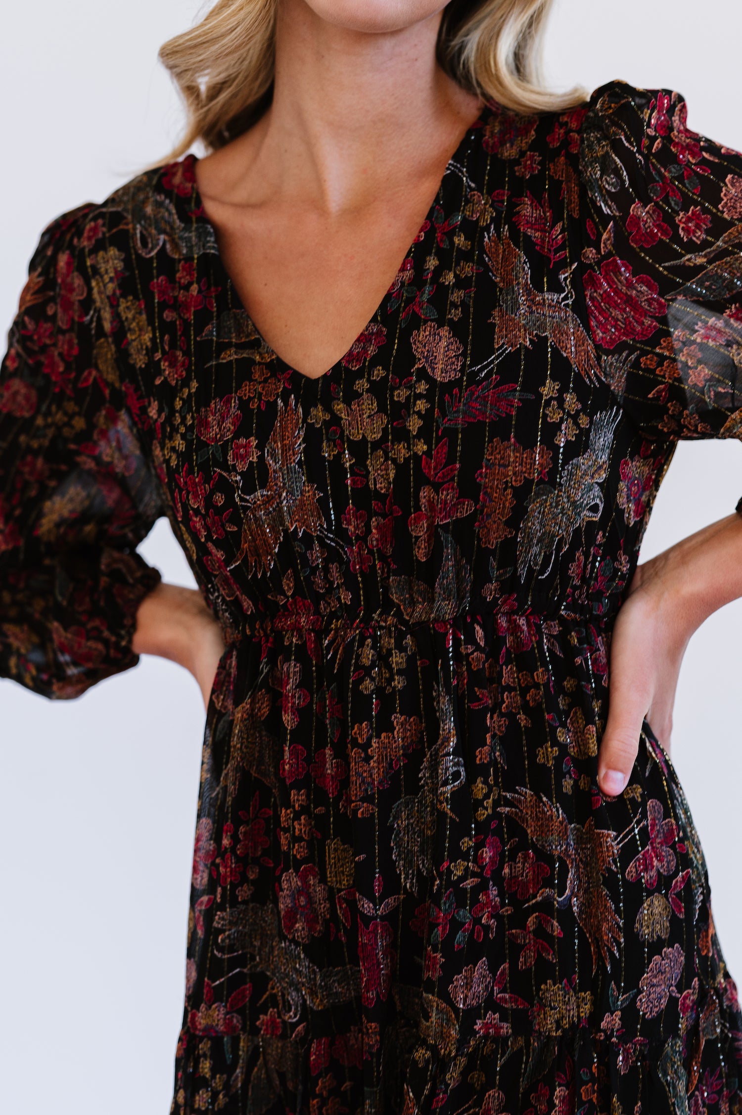 With a stunning autumn print and subtle gold stitching details, this midi A line dress has loose fit long sleeves, a V neckline and layered sheer lined fabric.