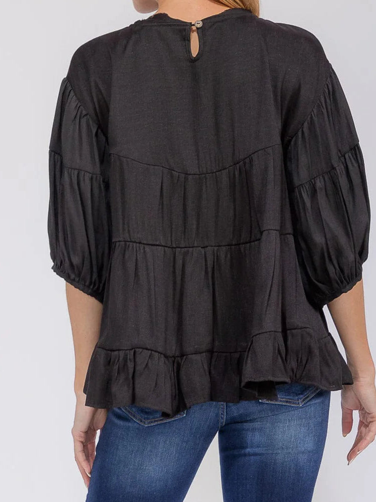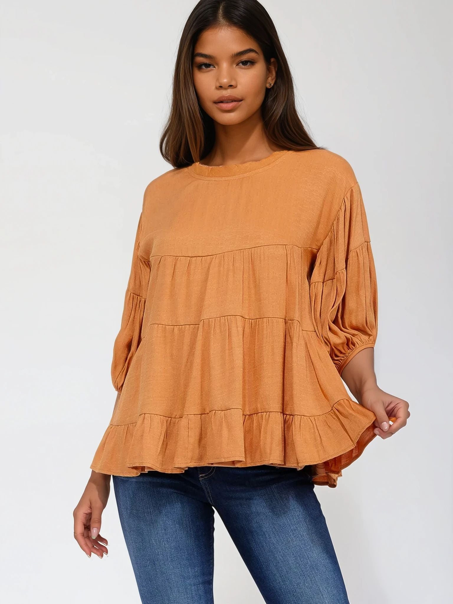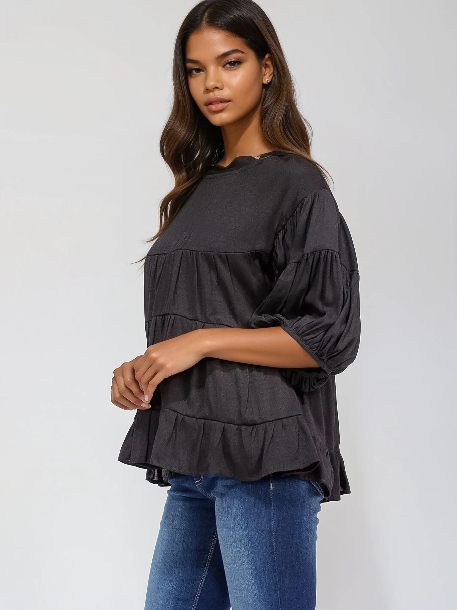 This short sleeve blouse features a tiered design and a loose fit, offering effortless sophistication and comfort. Its relaxed silhouette allows for easy movement, making it perfect for both casual and polished looks.