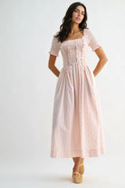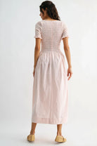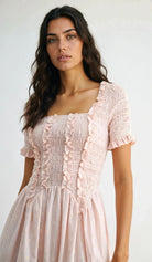 Embrace effortless elegance with this charming midi dress. The fitted smocked bodice provides gentle shaping while the soft pink fabric adorned with delicate daisy prints and subtle vertical stripes creates a refined, timeless aesthetic. Short sleeves and a modest square neckline offer comfort and versatility, while decorative ruffle trims along the bodice add subtle dimension.