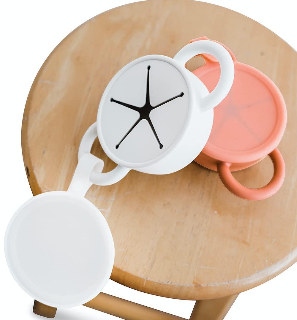 Who doesn't love a cute silicone snack cup? This is the best spill proof cup for toddlers! The two handles are perfect for little hands, and the clip on lid will assure a happy parent who doesn't have to go searching for it. The flanges are soft enough for hands to reach in and grab snacks, but hard enough to keep the snacks from all falling out. A no mess, no spill snack cup for toddlers and babies!