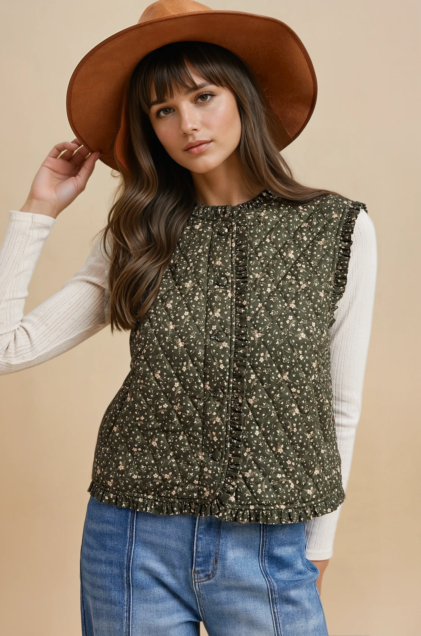 Elevate your layering with the Dailee Floral Quilted Vest, featuring a delicate floral print that adds a timeless touch. This sophisticated piece is enhanced by subtle ruffle details and refined button accents, combining texture and elegance effortlessly. Ideal for cooler days, the quilted design provides warmth while maintaining a polished silhouette.