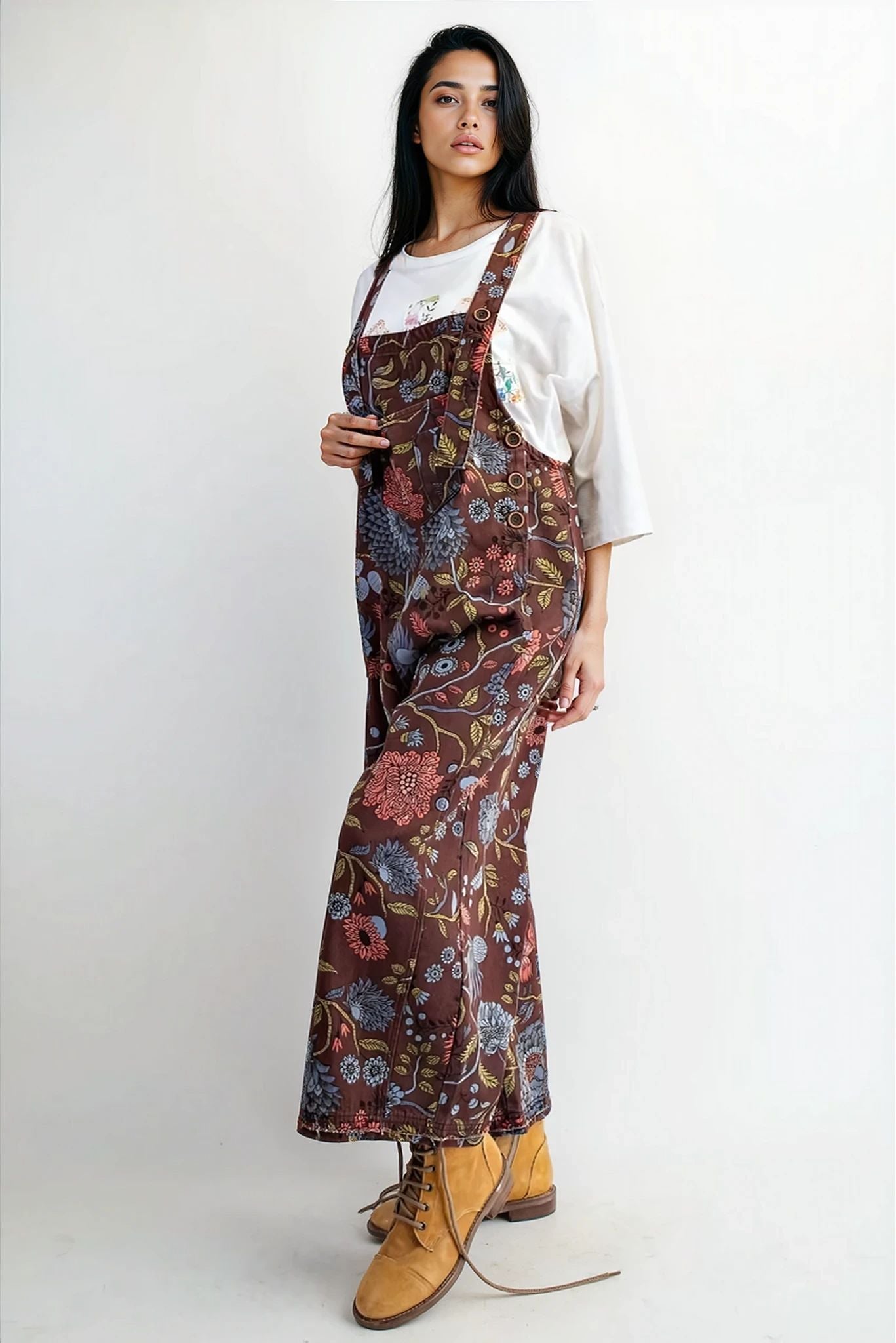 Frankie Floral Denim Overalls in Brown