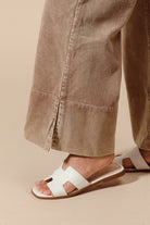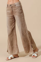 These taupe wide-leg flared corduroy pants combine effortless style with comfortable wearability. Crafted from soft, washed fabric, they offer a gentle texture and relaxed fit. The side slits add a refined detail that enhances movement and silhouette, making these pants an elegant choice for both casual and polished looks.