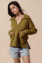 The Sandy Pullover Sweater in Olive features a classic flap collar design paired with practical patch pockets, combining timeless style with everyday functionality. Crafted for versatile layering, its comfortable fit and rich olive tone make it a sophisticated choice for both casual and refined looks. Perfect for cooler days, this sweater provides warmth without sacrificing elegance.