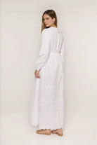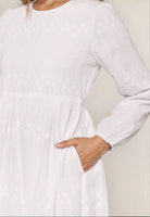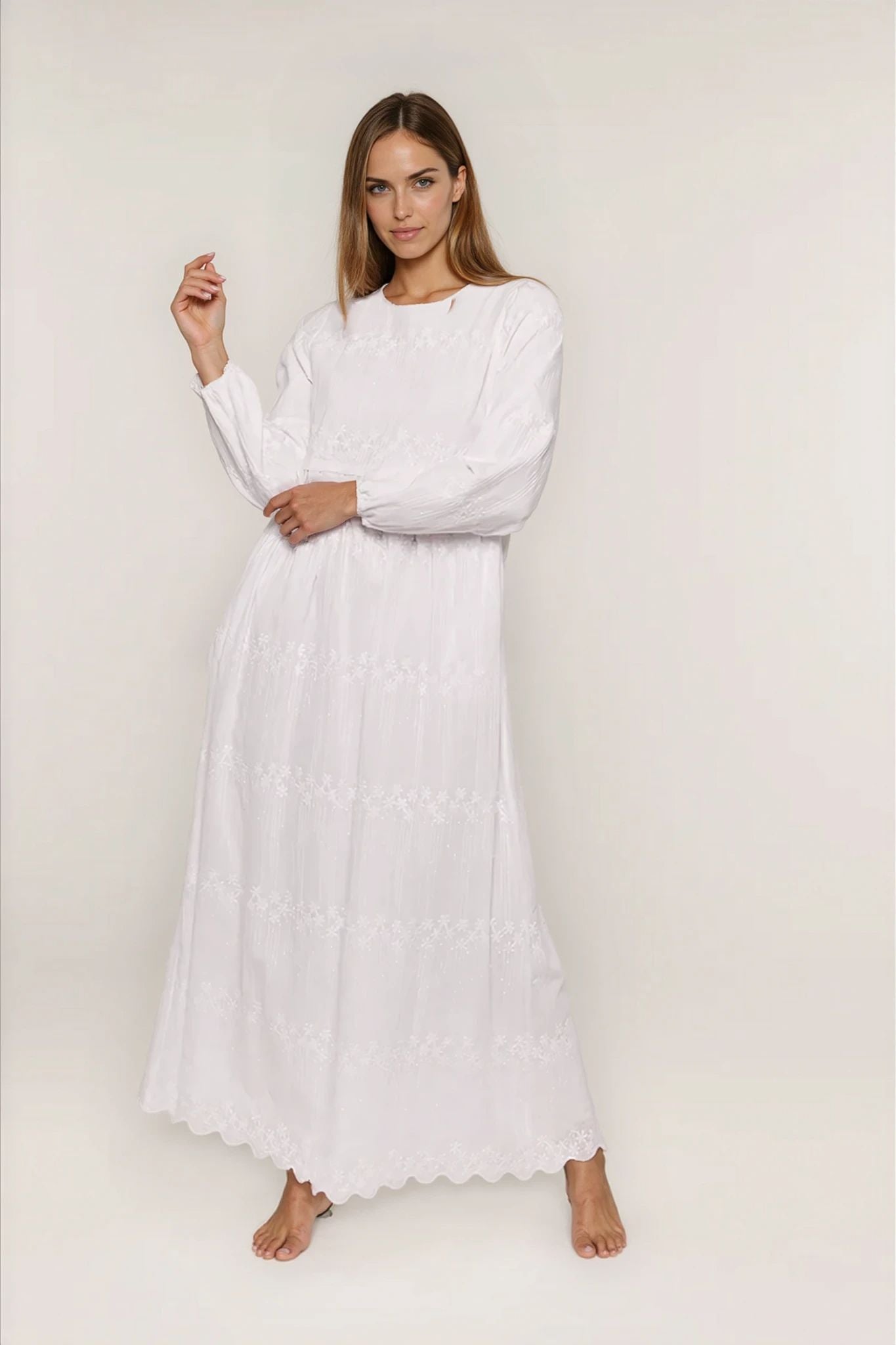 Elevate your temple experience with our Juniper Temple Dress. This white maxi dress features delicate floral details and a modest, comfortable fit, plus it's made of 100% cotton.. With a round neck and luxurious feel, embrace the sophistication and exclusivity of this dress. Perfect for any spiritual occasion.