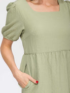 This sophisticated midi dress features a flattering square neckline and short sleeves for a refined silhouette. Thoughtfully designed with front pockets, it combines style and practicality, while the tiered midi length adds elegant movement to your look. Perfect for occasions that call for understated yet polished fashion.