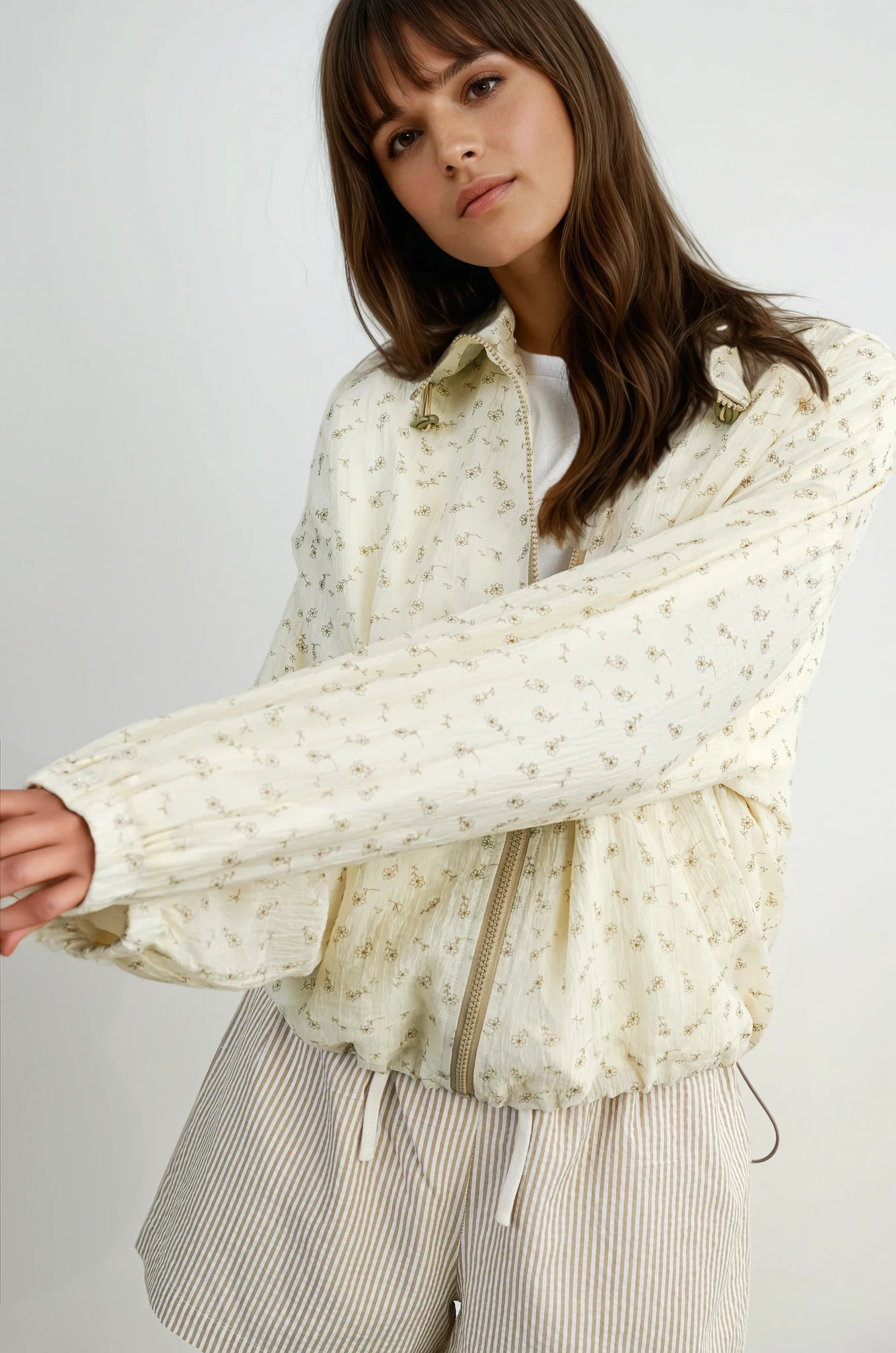 Elevate your autumn wardrobe with the Desi Floral Collared Jacket. Featuring a refined zip-up front and elegant collared detail, this jacket showcases a delicate floral design perfect for the season. Its versatile style makes it an essential fall staple, blending sophistication with everyday comfort.