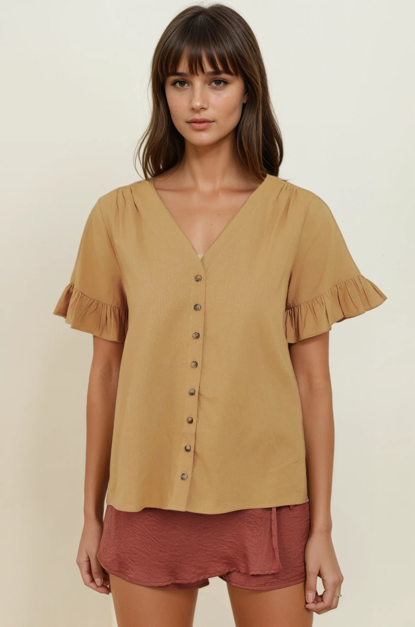 Elevate your autumn wardrobe with the Sammy Top, featuring elegant ruffle sleeves and a refined button-up front. Its short sleeves offer a graceful balance between comfort and style, making it perfect for layering or wearing alone during fall. This sophisticated piece seamlessly blends classic details with seasonal charm.