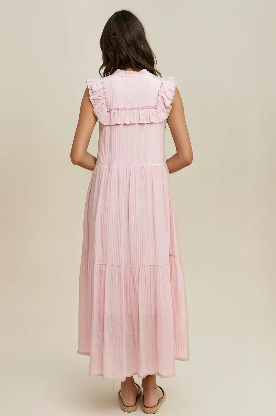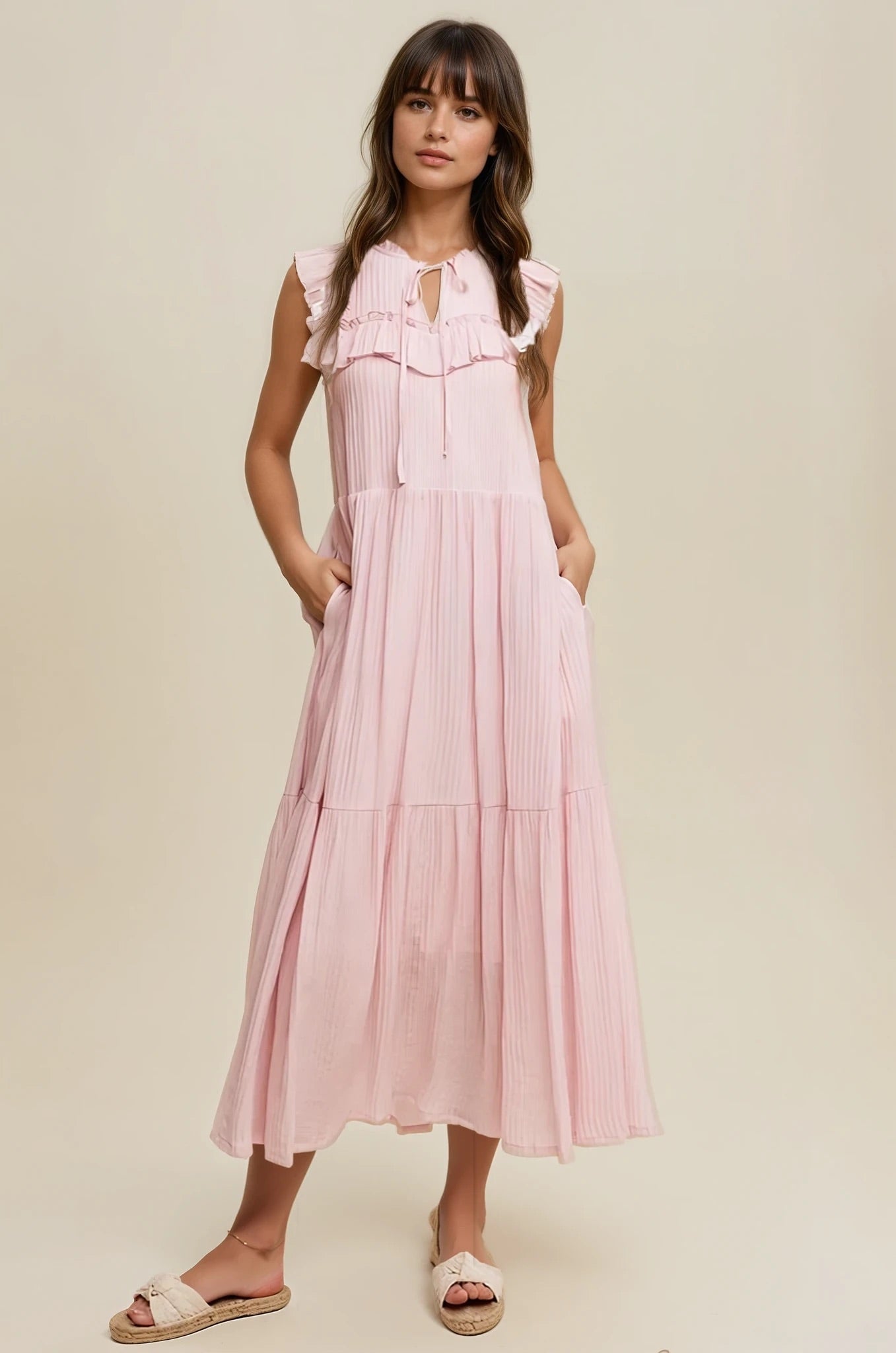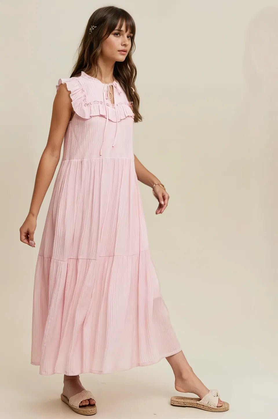 Introducing the Scottie Summer Maxi Dress, a dreamy and luxurious piece perfect for your summer wardrobe. With its elegant ruffle collar, flattering front tie, and flowing design, this maxi dress exudes sophistication and style. Embrace the warm weather in this ultimate summer maxi dress.