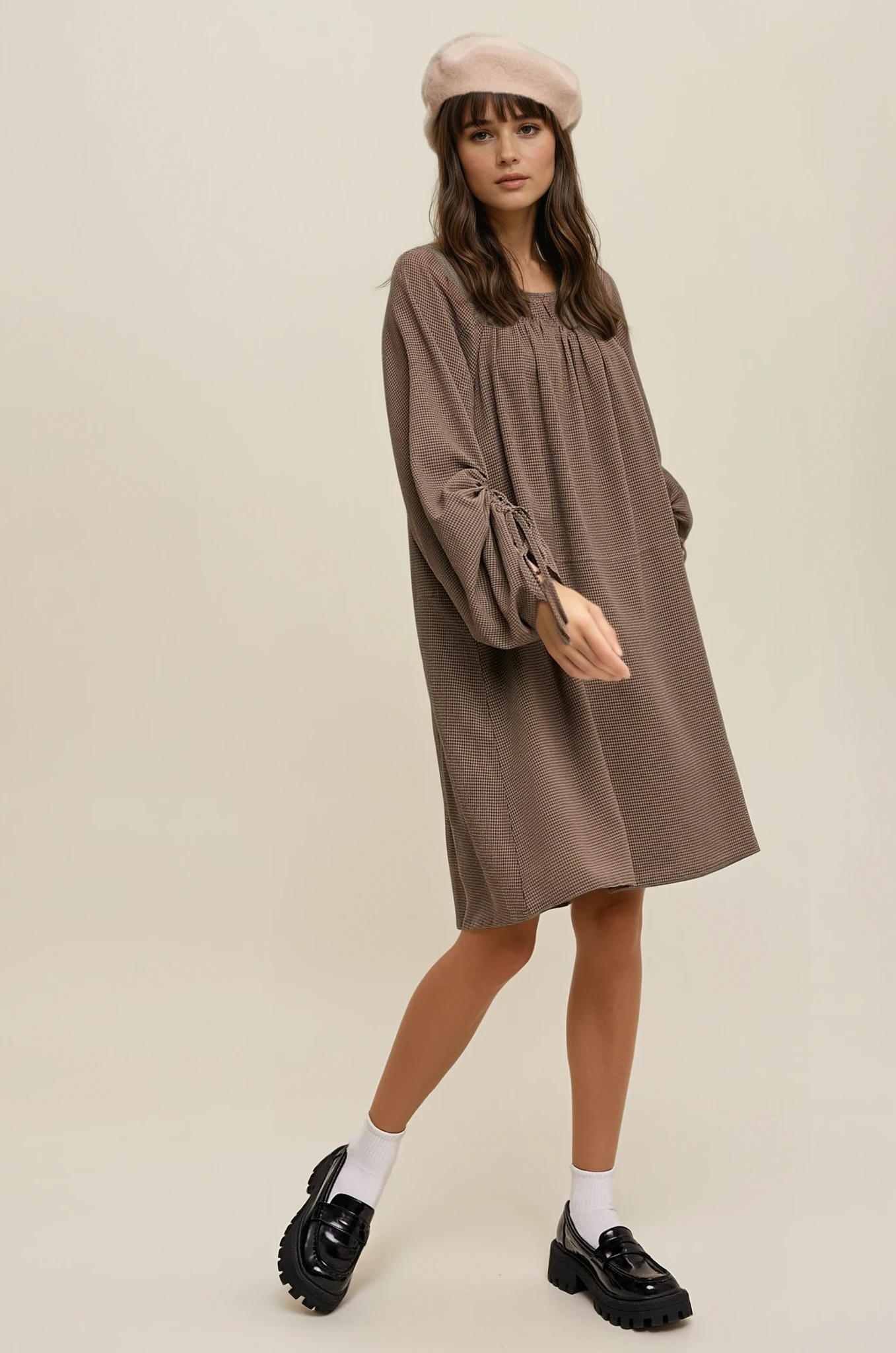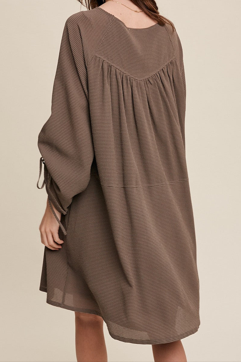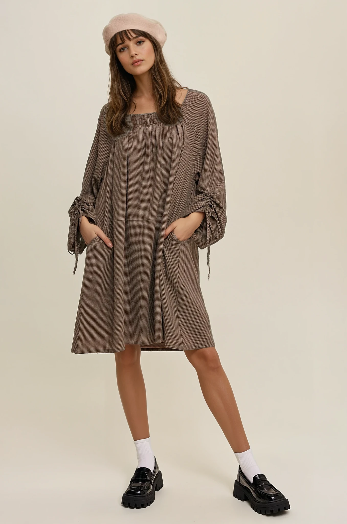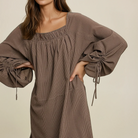 The Margo Square Neck Knit Dress features a sophisticated waffle texture and a flattering square neckline adorned with delicate baby ruffles. Its long sleeves include adjustable ruched strings for a customizable fit, while hidden side seam pockets add discreet practicality. Designed with an oversized silhouette and finished with a clean hem, this lined dress offers both comfort and elegance for any occasion.
