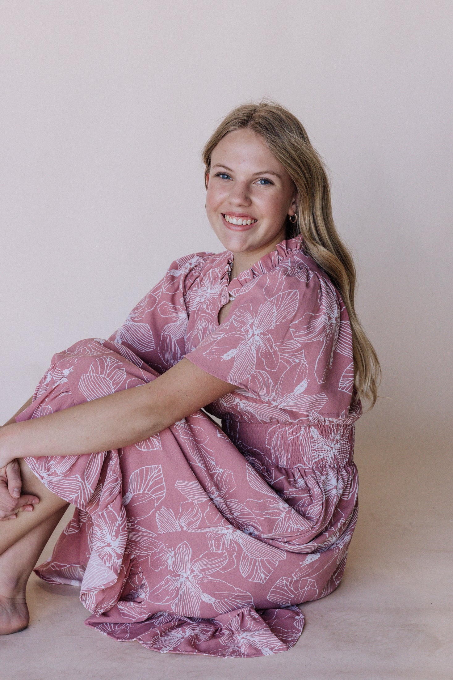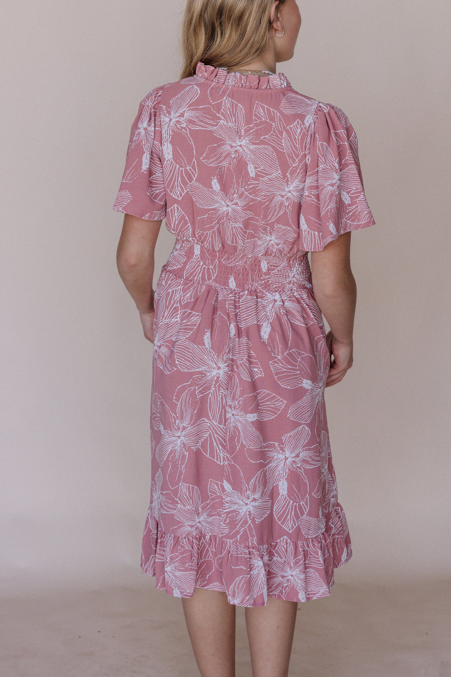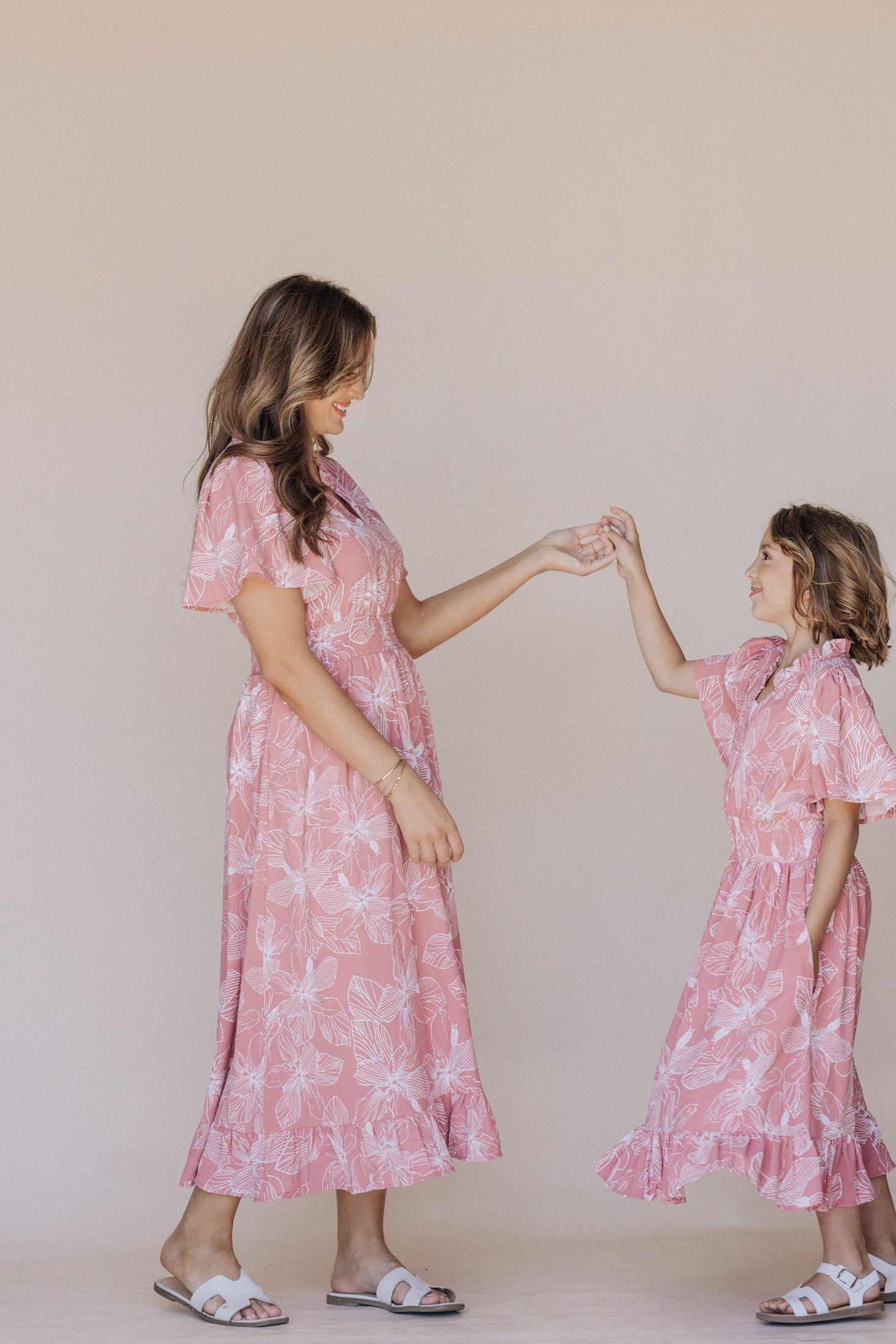 Create a chic mother-daughter look with our Gabby Maxi Dress in Light Pink. The matching mommy and me design adds a touch of elegance to this comfortable piece. The elastic waistband, pockets, and flutter sleeves provide a perfect fit and effortless style.