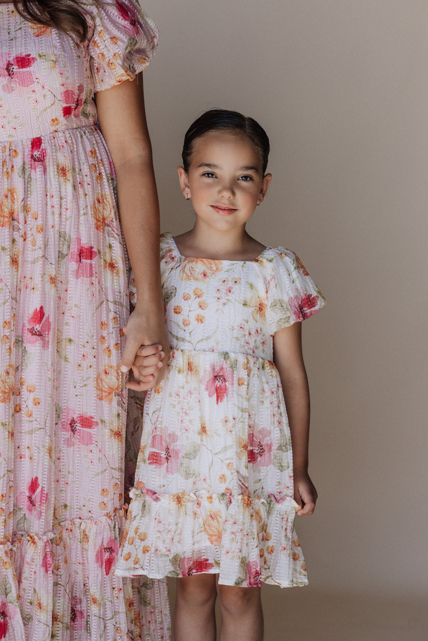 Introducing our Greta Maxi Dress in White for Kids. This stunning mommy and me matching design features a delicate floral print and elegant puff sleeves. The ruffle skirt adds a playful touch, while the round neck adds a touch of sophistication. Elevate your family's style with this exclusive and tasteful dress.