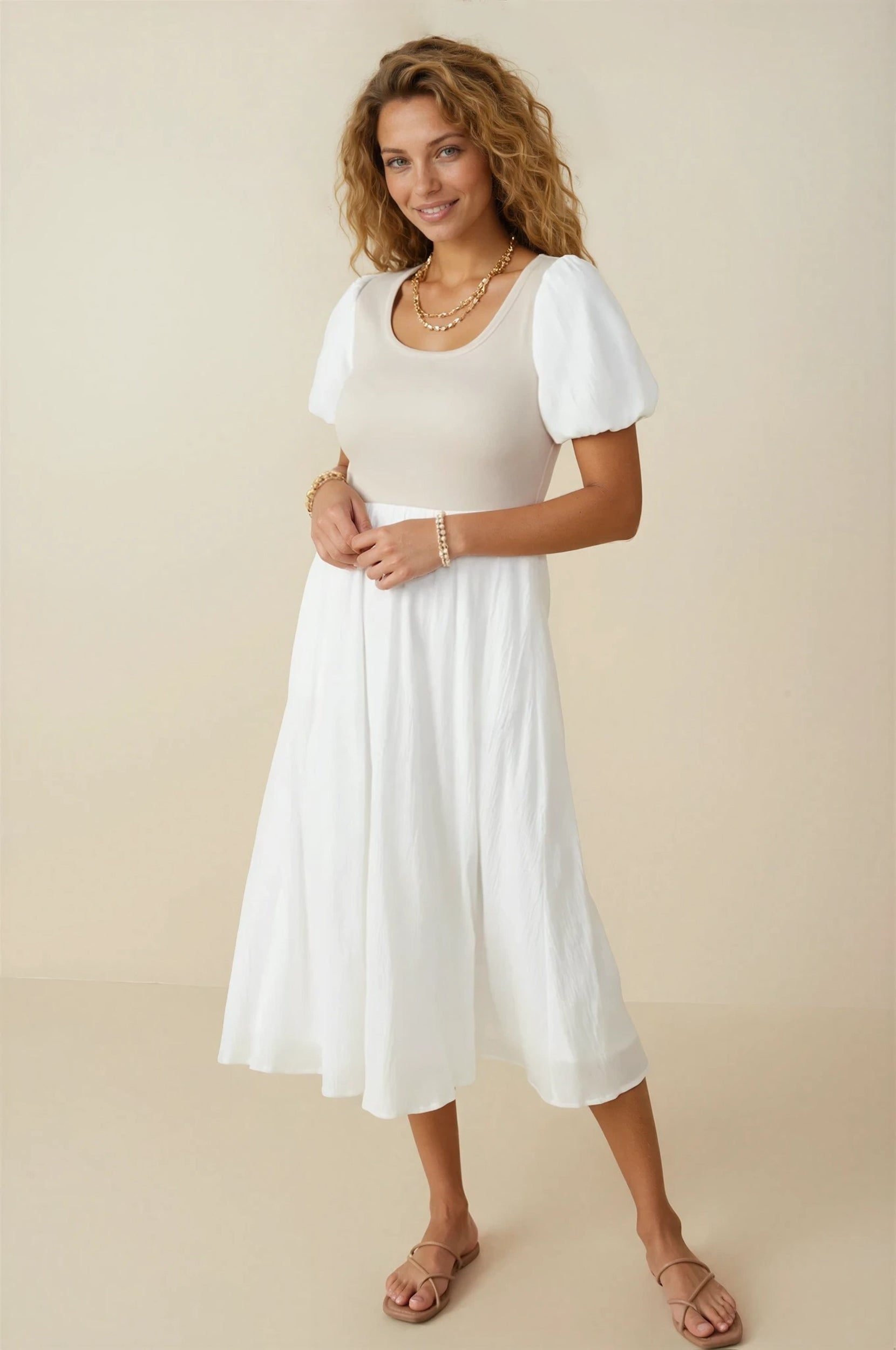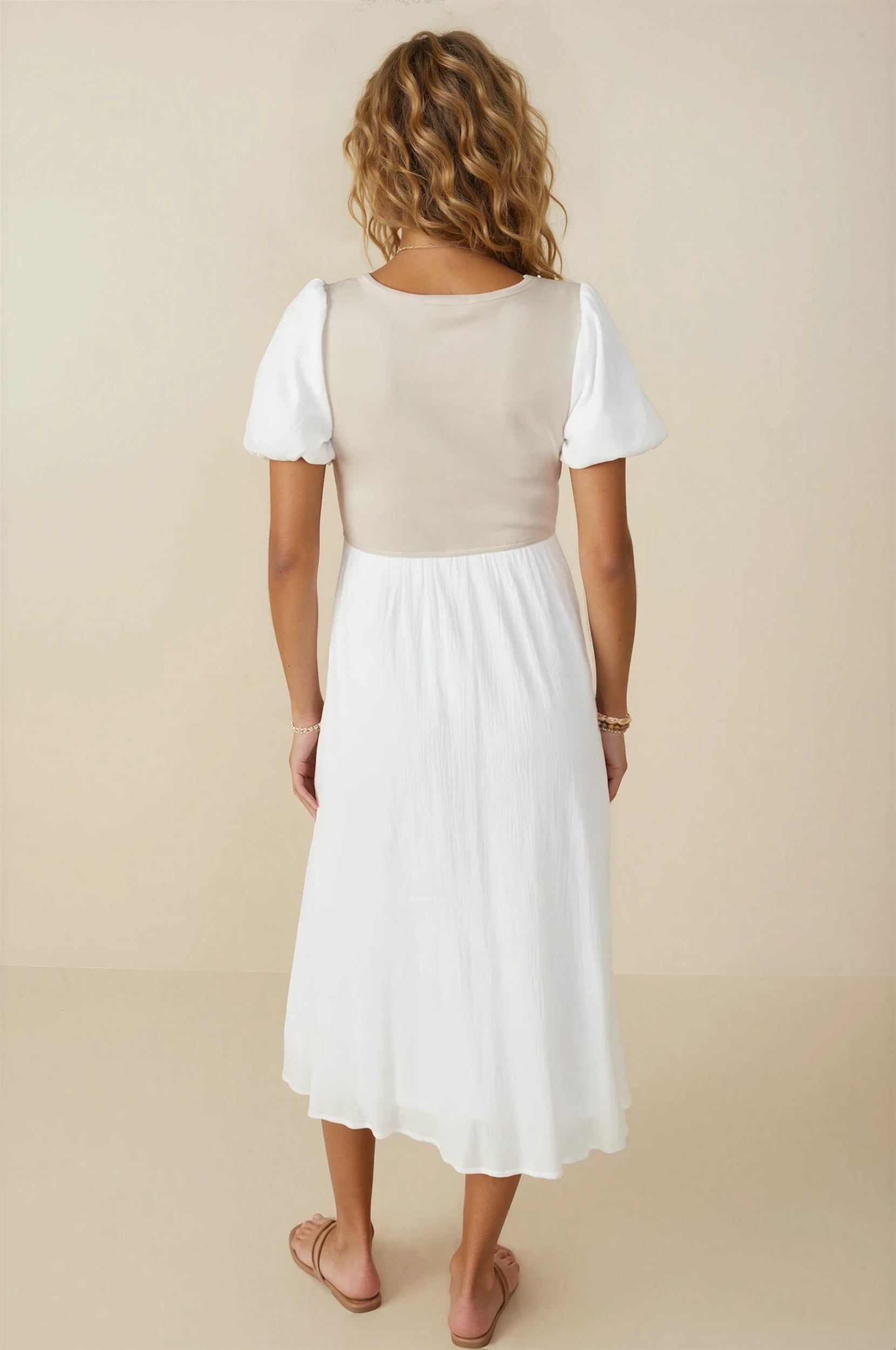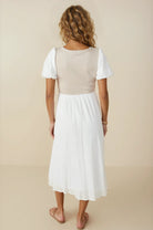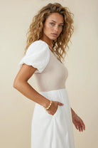 Introducing the exquisite Brooke Ribbed Bodice Dress, featuring a mixed media top that effortlessly blends style and comfort, it's one of our favorite modest dresses. The ribbed bodice creates a flattering silhouette, while the puff sleeves add a touch of elegance. With a midi length and modest design, this dress is perfect for any occasion.