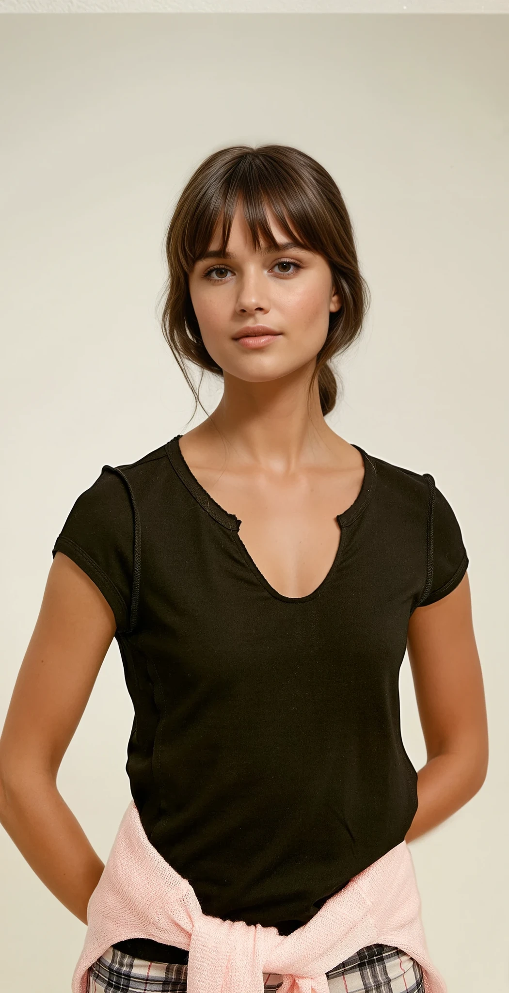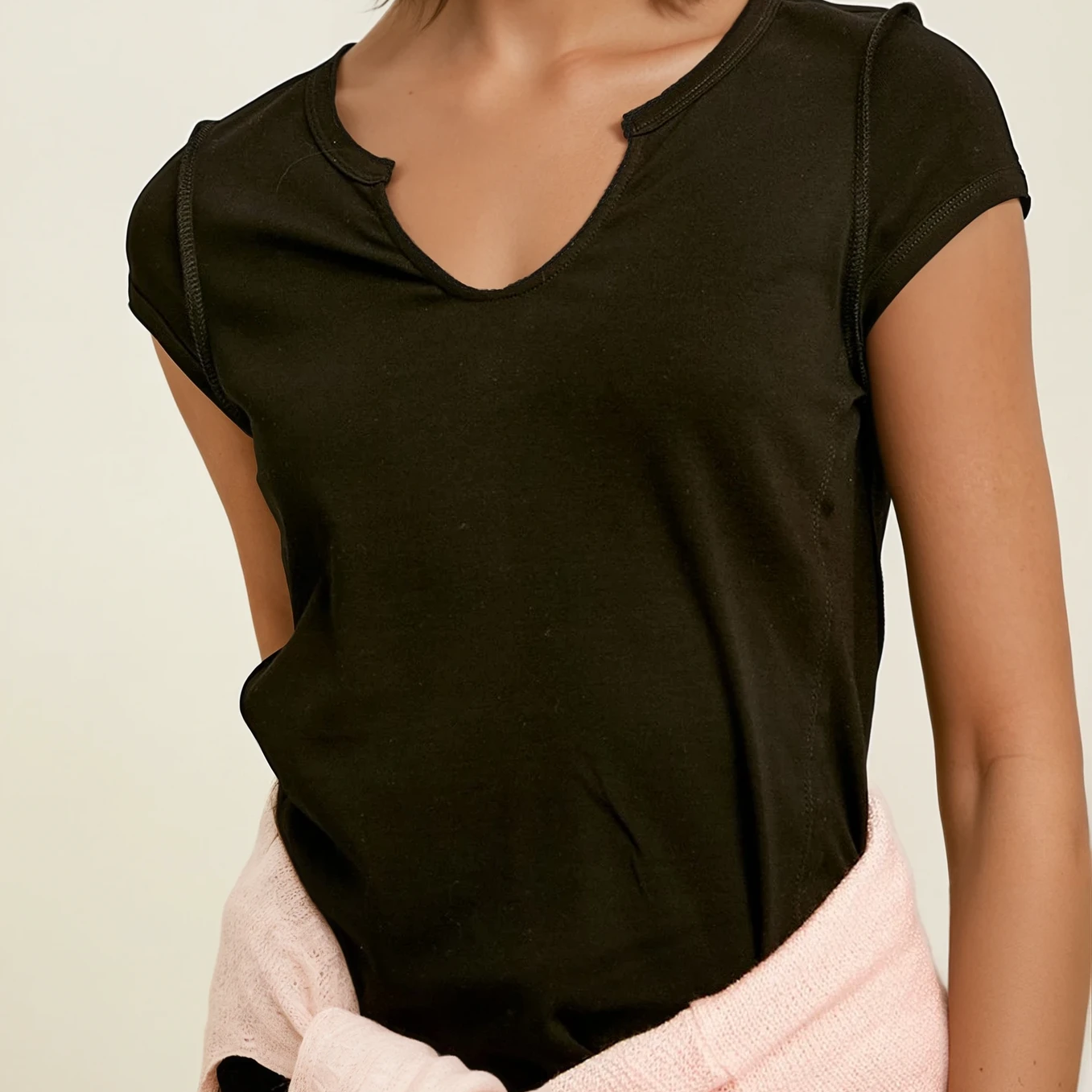 Experience effortless style with the Not Too Basic Top, crafted from soft fabric for all-day comfort. Its round neckline features a subtle V-shaped detail at the center front, adding a touch of elegance. Short cap sleeves with reverse seam detailing create a unique silhouette, while a patch detail on the back enhances its modern appeal. Finished with a clean hem, this top is perfect for elevating your everyday wardrobe with understated sophistication.