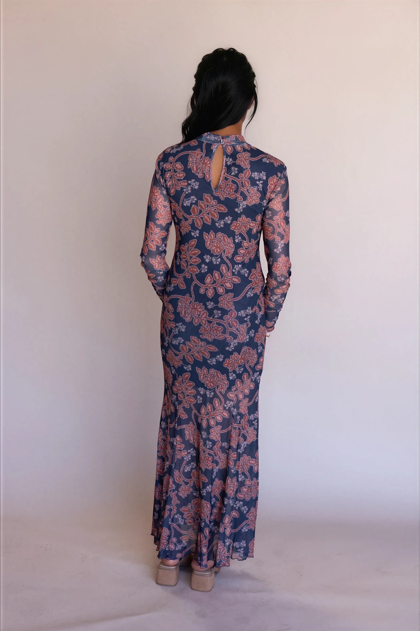The Julietta Fitted Maxi Dress features a sleek, fitted design with long sleeves, making it an essential piece for your fall wardrobe. Its tailored silhouette and mock neck enhances your figure while providing comfortable coverage, perfect for transitional weather with a touch of refined elegance. The shell is a lightweight, slightly sheer fabric.