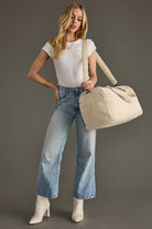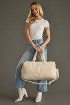 Ideal for weekend getaways or trips to the temple, this cream corduroy duffel features a zipper closure, an interior zipper pocket, and two small open compartments. Measures 19" x 9" x 11".