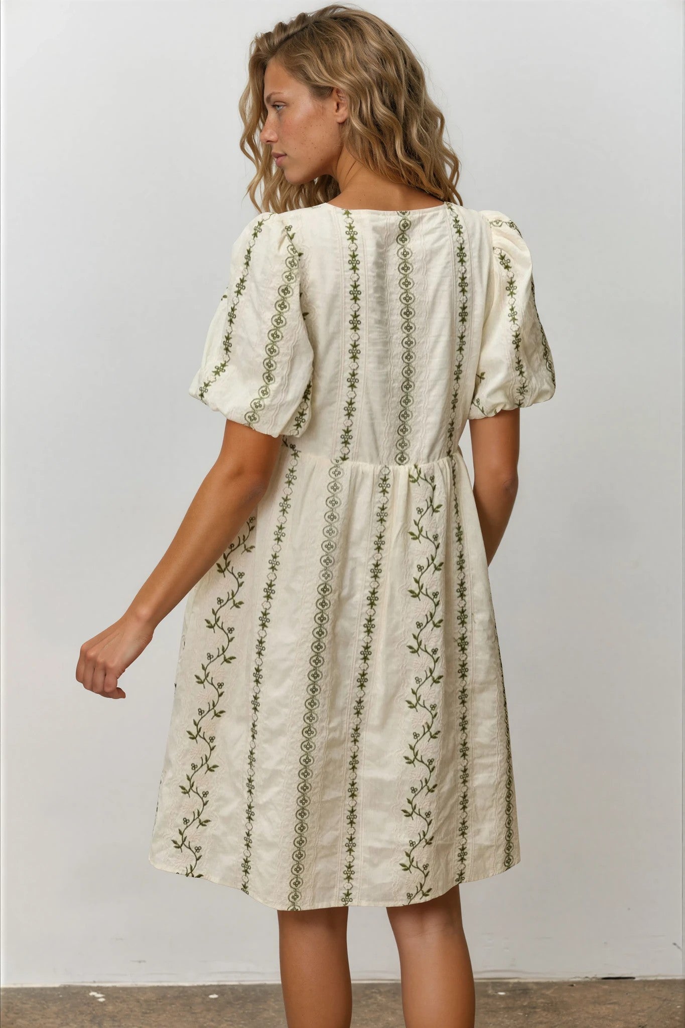 Embrace understated sophistication with the Amara Embroidered Mini Dress, a refined piece that captures the essence of spring elegance. This cream-hued design features meticulously crafted vertical green floral embroidery paired with delicate eyelet accents, creating an effortlessly romantic aesthetic.
