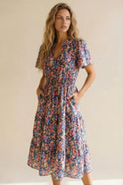 Meet the Nova Maxi Dress—where comfort meets pure joy. This delightful woven dress boasts a fitted bodice with a smocked waist that hugs you just right, then flares into a tiered skirt that dances all the way to your ankles. The notch neckline and puffed sleeves bring a sweet, vintage-inspired vibe, while the cheerful floral print keeps things fresh and fun. A playful frill hem adds extra movement, and hidden side pockets!
