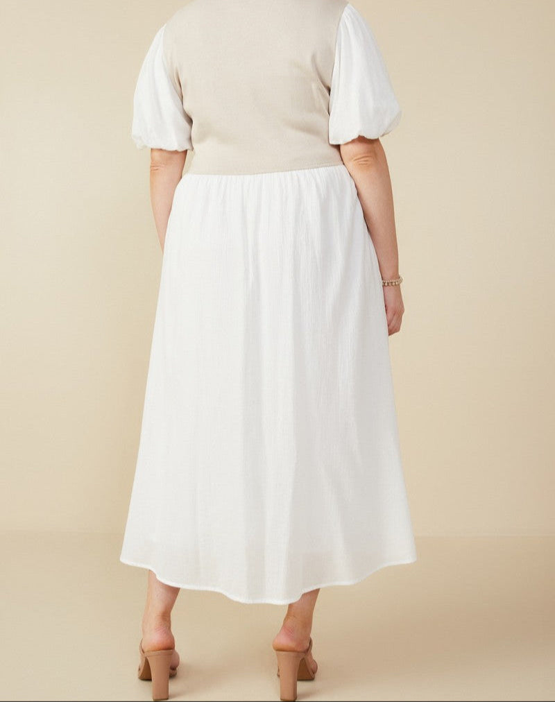 Introducing the exquisite Brooke Ribbed Bodice Dress, featuring a mixed media top that effortlessly blends style and comfort, it's one of our favorite modest dresses. The ribbed bodice creates a flattering silhouette, while the puff sleeves add a touch of elegance. With a midi length and modest design, this dress is perfect for any occasion.