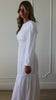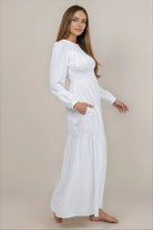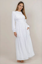 The Heidi Temple Dress offers a sophisticated silhouette with its stretchy fit and modest design. Crafted in crisp white, this long-sleeve maxi dress features a graceful round neckline, combining elegance with comfort for a timeless look. Perfect for occasions that call for refined simplicity. Hip pockets included