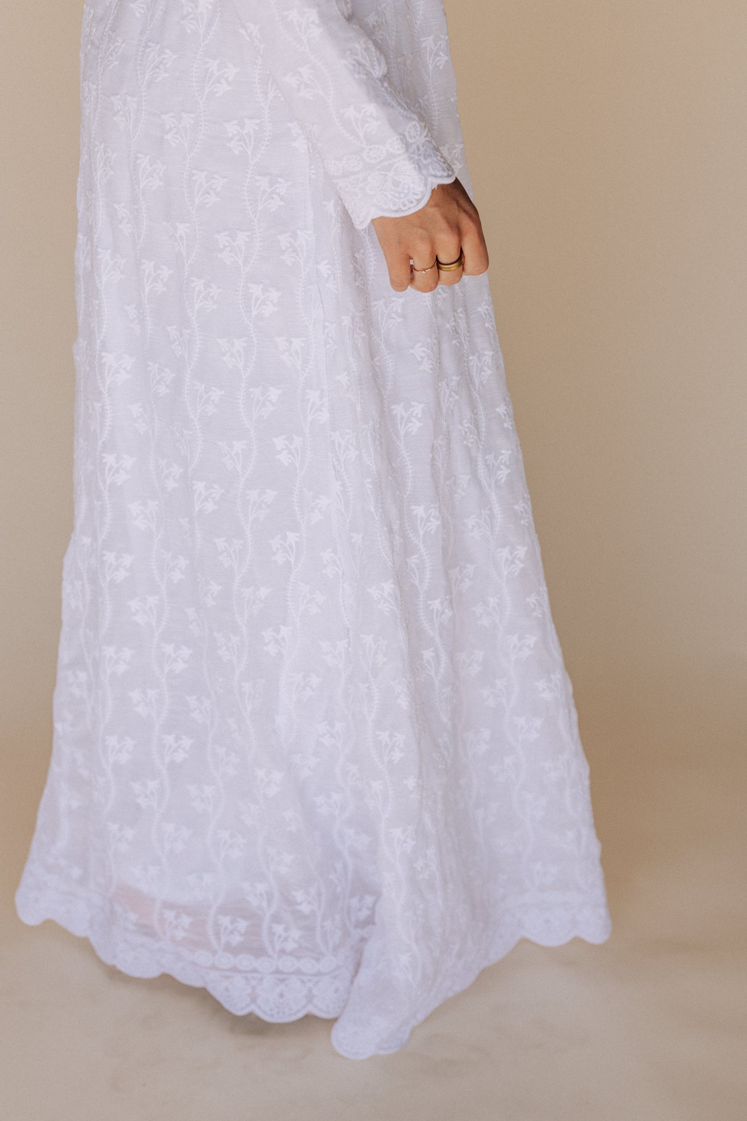 The Logan Temple Gown is the epitome of elegance and comfort. With its intricately embroidered design and back zipper closure, this LDS temple dress exudes sophistication and ease. Its hip pockets make it practical for all-day wear, allowing you to focus on the sacredness of the temple.