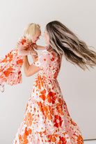 How adorable is this mommy and me dress? This beautiful floral dress has a stretchy smocked bodice and is fully lined. It has embroidered lace details that we all love.
