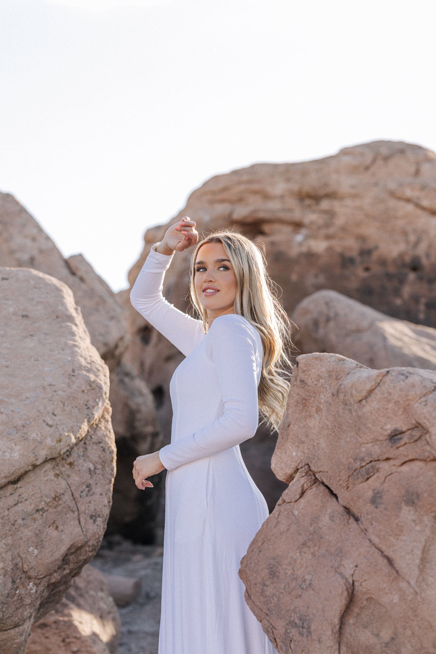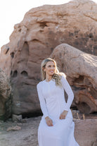 This LDS temple dress is a luxurious and exclusive addition to your collection. This white maxi dress features a long sleeve design and a front zipper easy entry. The material is super soft and very stretchy, like a thick cozy t-shirt. Hip pockets included. This dress is ideal for those with long days in the temple.