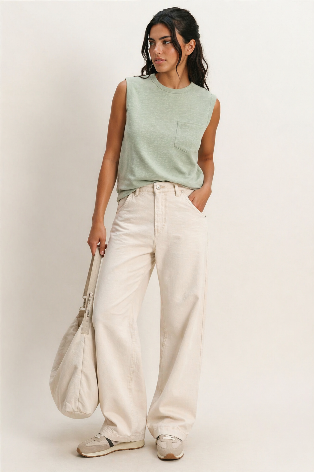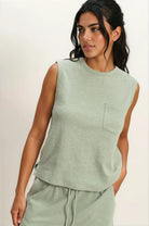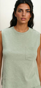 Effortless comfort meets timeless style with the Aria Tank in Sage. Crafted from soft cotton, this sleeveless essential features a ribbed crew neckline and relaxed fit that moves with you throughout the day. A functional front patch pocket at the chest adds practical detail, while the center seam accent on the back elevates the design. The ribbed armholes provide a polished finish.