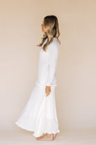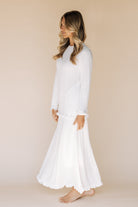 Indulge in sophistication and elegance with our Abigail Fitted Temple Dress. Made with stretchy material and featuring a fitted design, this maxi length white dress accentuates your figure. The delicate lace detail and long sleeves add a touch of class, perfect for any LDS temple ceremony. Hip pockets included