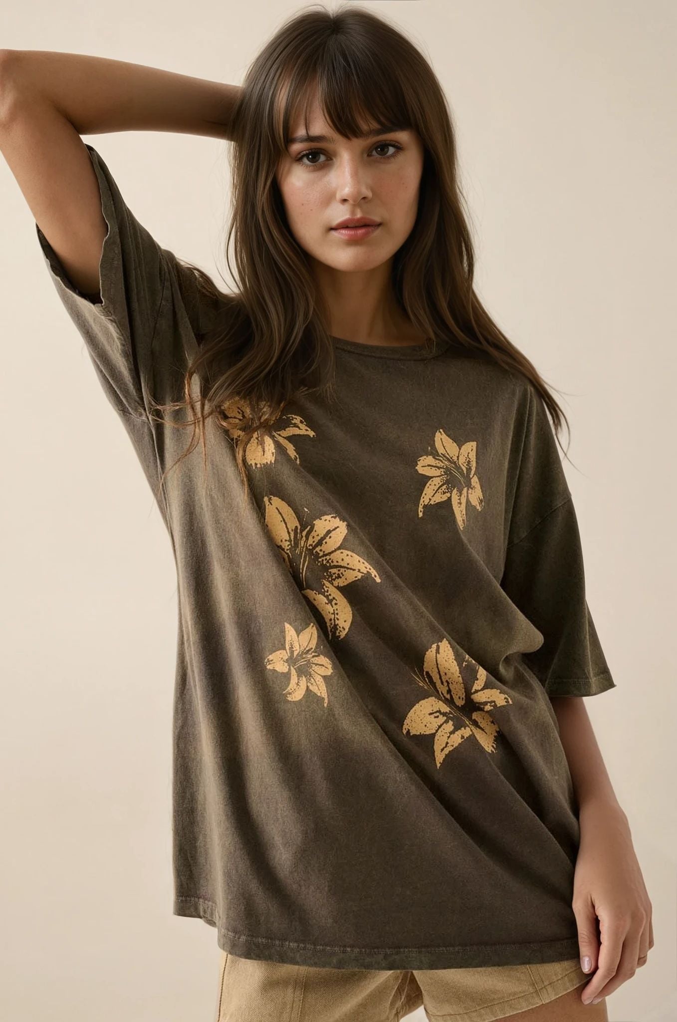 Elevate your summer wardrobe with the Lilies Vintage-print Oversized Graphic Tee. This sophisticated piece combines a timeless vintage graphic with a relaxed, oversized fit, offering both comfort and style. Perfect for warm days, it pairs effortlessly with your favorite shorts or jeans, making it a versatile choice for a chic, laid-back look.