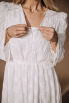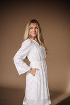 The Miranda Temple Dress exudes elegance with its white lace design and delicate lace skirt overlay. Stay practical with hidden hip pockets and a functional front button closure. The elastic waistband provides comfort while maintaining a flattering silhouette. Perfect for a special occasion or regular LDS Temple attendance.